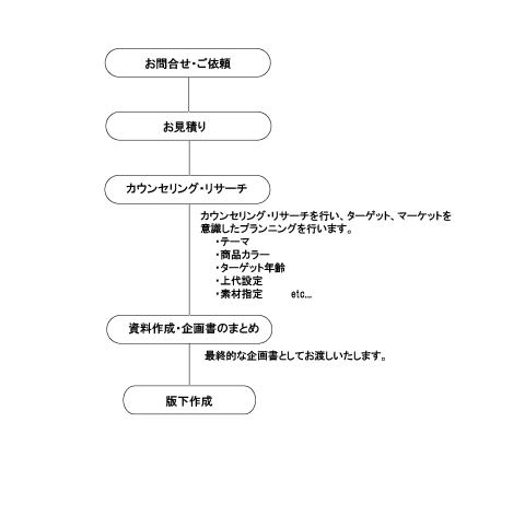 豊富な知識を持つ営業と、デザイナーがカウンセリングさせていただき、企画書・デザイン画へと提案してまいります。デザイン画完成後も、原型・サンプル作成・量産といった一連の工程を一貫して承ることができます。
